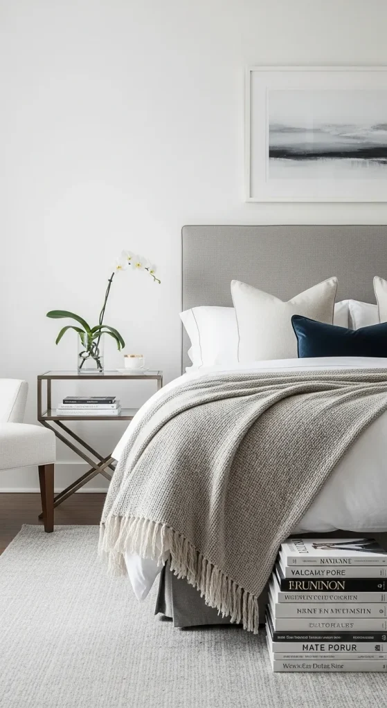 To add depth, mix different textures such as knitted throws, velvet cushions, and woven baskets. This neutral palette is perfect for people who love minimal yet elegant bedroom designs.