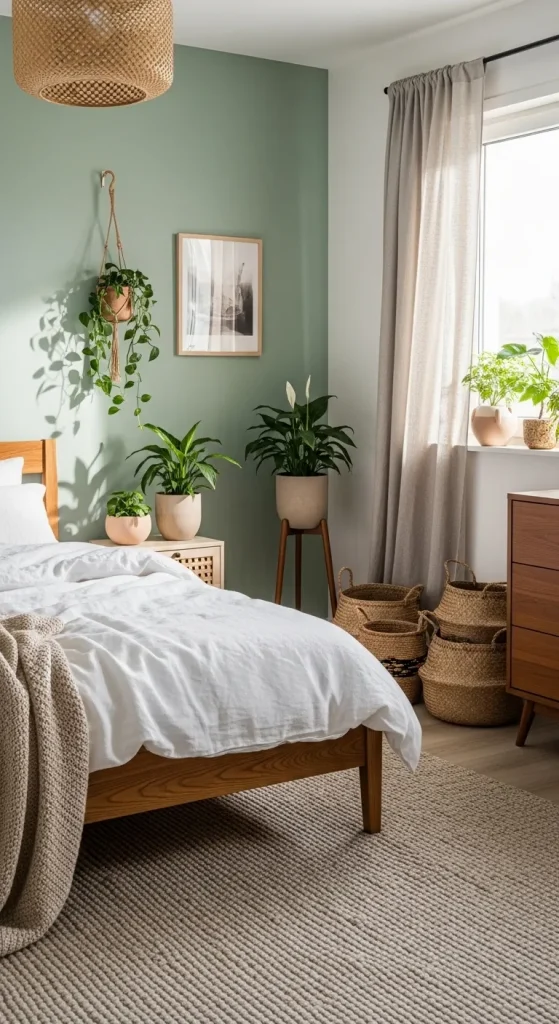 A sage green wall paired with white bedding and natural wood furniture creates a refreshing and peaceful atmosphere. Add indoor plants, woven baskets, and linen curtains to enhance the organic look.