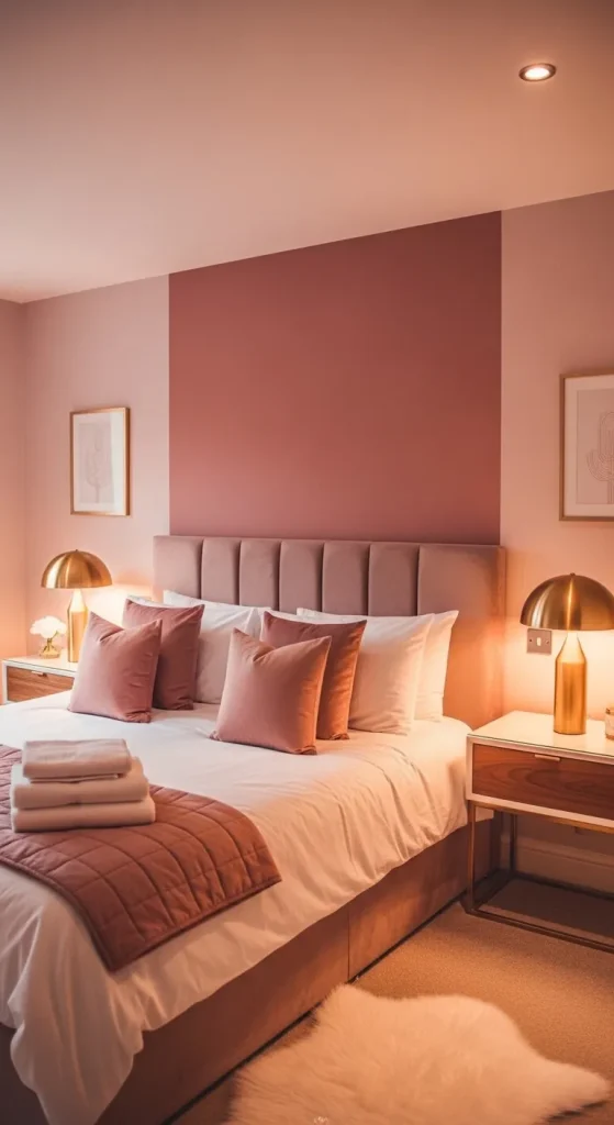 A dusty rose accent wall behind the bed can instantly elevate the room. Pair it with white bedding, gold lamps, and soft blush-toned cushions for a delicate and luxurious feel. Adding floral artwork or subtle wall decor can make the space even more elegant.