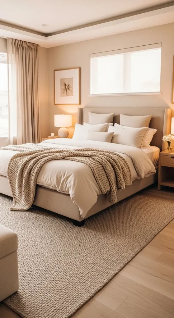 A beige upholstered bed paired with cream bedding can create a hotel-like feeling of comfort. Adding wooden nightstands, warm lighting, and textured rugs enhances the cozy vibe. Soft linen curtains and decorative pillows in subtle shades can complete the look.