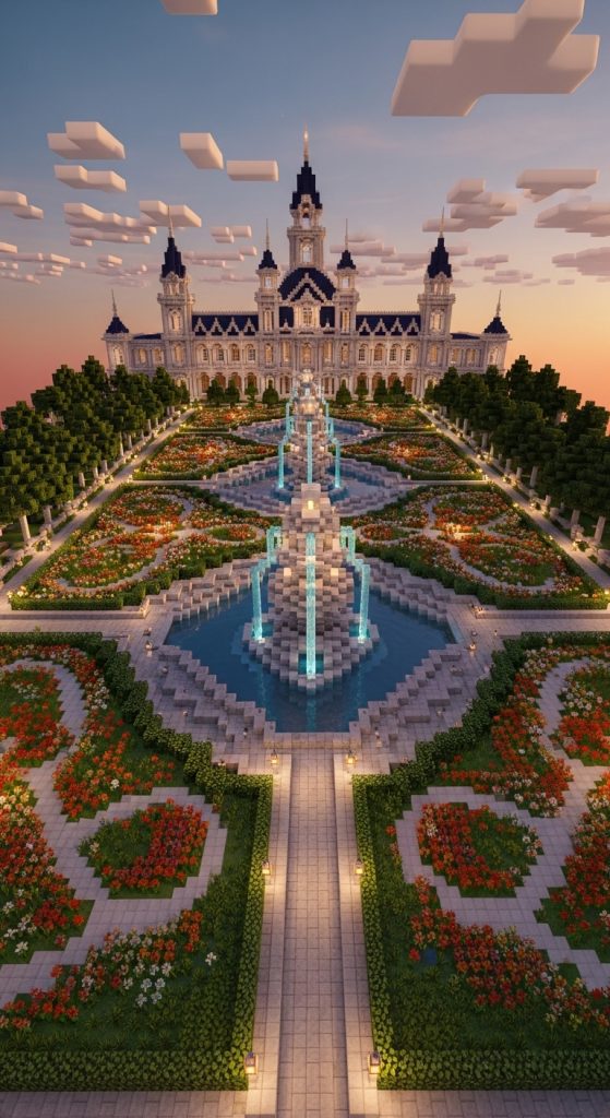 Using quartz, stone bricks, and decorative pillars can give the mansion a grand appearance. Large symmetrical gardens with fountains, statues, and flower pathways can make the entire property look majestic.