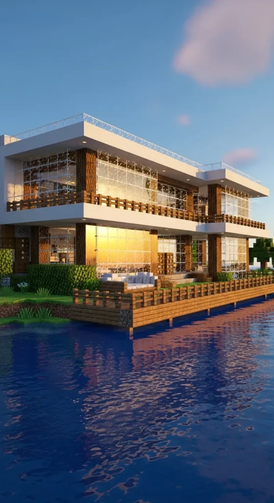 Large glass walls allow sunlight to fill the entire mansion. Wooden decks, docks, and small boats can add extra detail to the build.