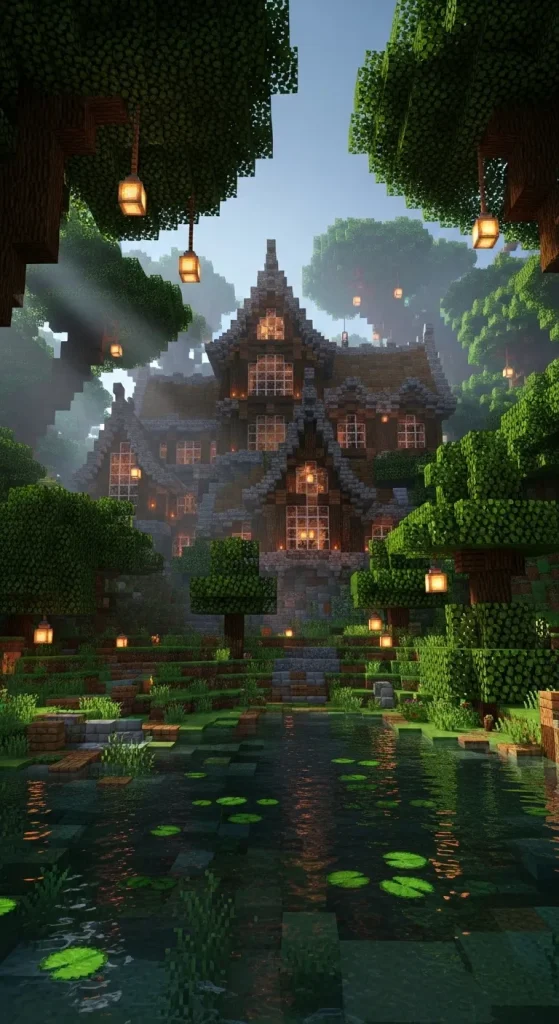 Players can add tree bridges, hidden entrances, and glowing lanterns to enhance the mystical vibe. This mansion style is perfect for players who want a calm and immersive forest retreat.