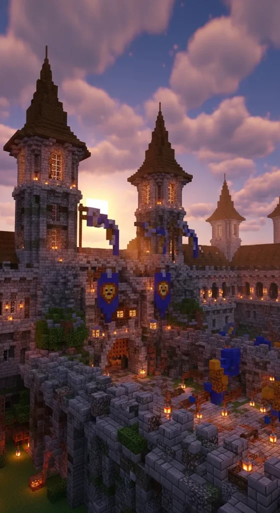 Using materials such as cobblestone, stone bricks, dark oak wood, and mossy blocks can create an authentic castle appearance. Towers, battlements, and grand gates make the structure feel powerful and royal.
