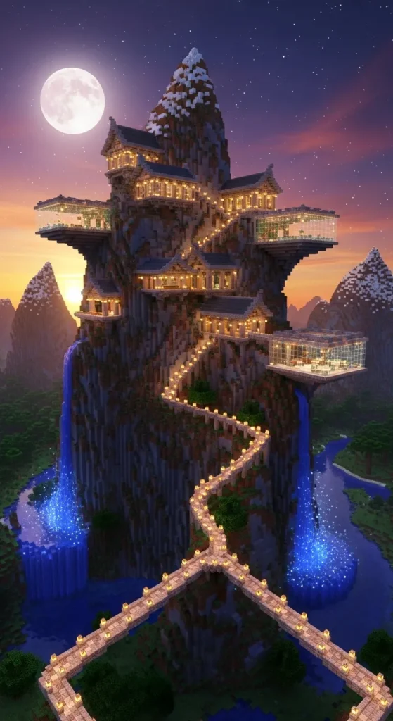 A mountain cliff mansion creates a dramatic and breathtaking build. This mansion is built directly into the side of a mountain or cliff, giving it a natural yet powerful appearance.