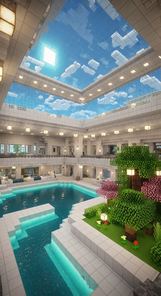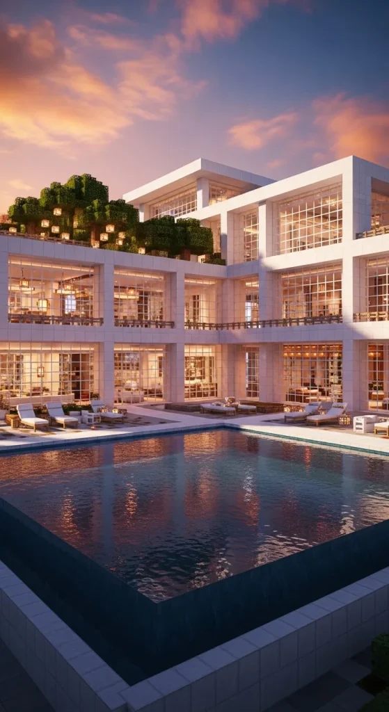A modern luxury mansion is one of the most popular builds in Minecraft. This design focuses on clean lines, large glass windows, white concrete walls, and open spaces. The goal is to create a sleek and futuristic home that feels bright and spacious.
