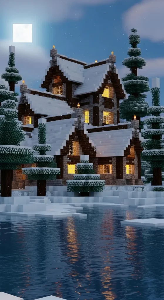 Spruce wood, stone bricks, and large fireplaces help create a warm and inviting design. Snow-covered roofs, glowing lanterns, and frozen lakes nearby can make the scenery stunning.