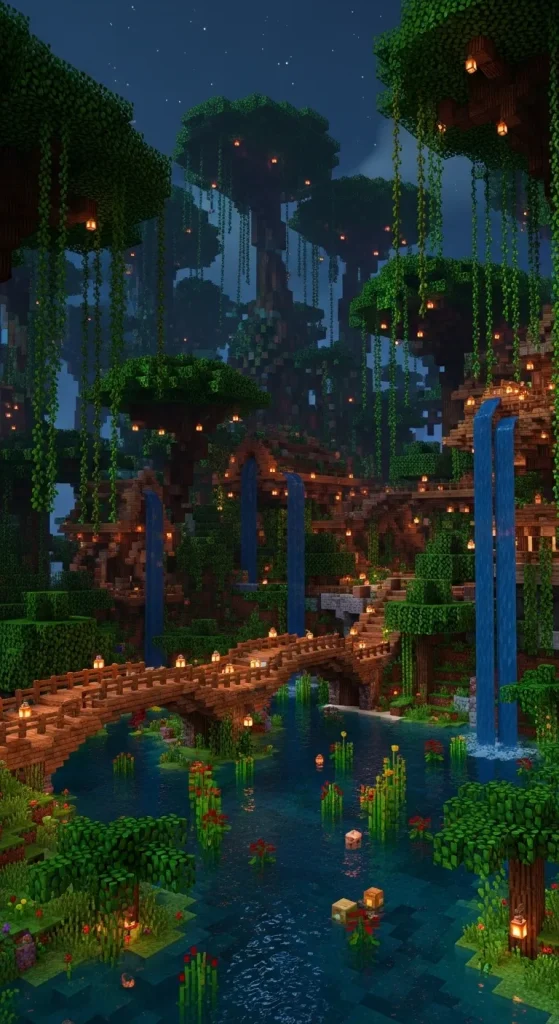 Players often add hanging bridges, waterfalls flowing down the cliff, and glowing lantern pathways to give the build a magical atmosphere. This type of mansion feels adventurous and luxurious at the same time.