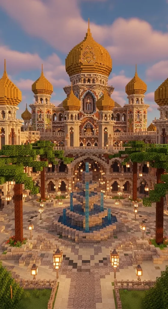 Using sandstone, smooth sandstone, terracotta, and gold accents can create a stunning palace appearance. Palm trees, fountains, and gardens inside courtyards make the build feel alive.