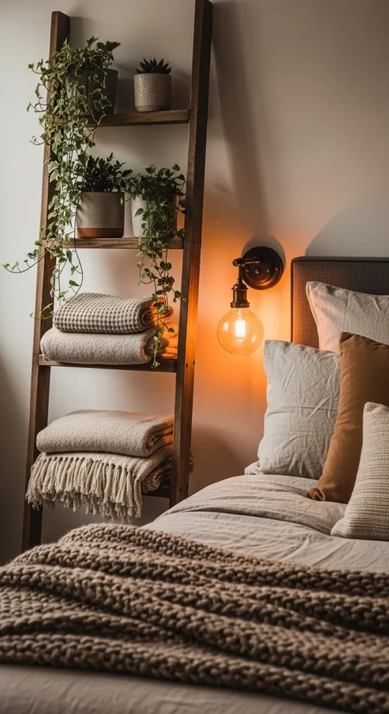 A ladder shelf leaning against the wall behind or beside the bed creates a relaxed and stylish storage solution.