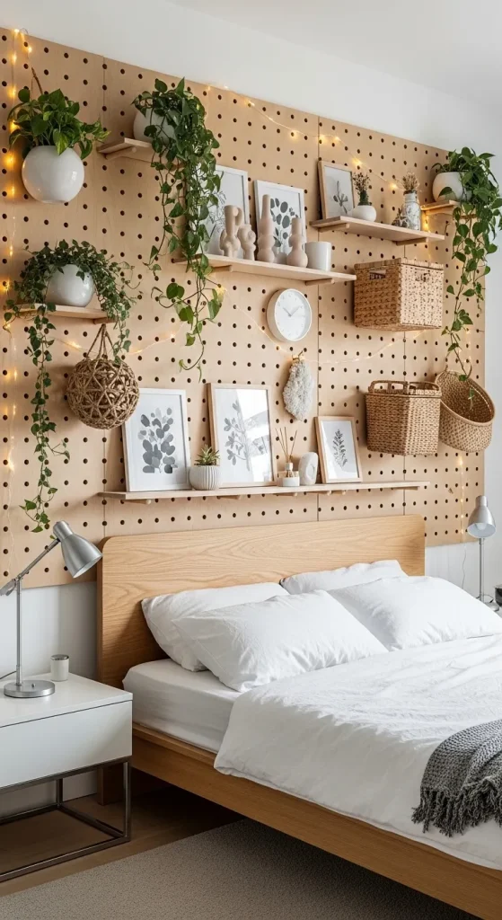 You can hang small baskets, plants, lights, or decorative items on the pegboard to create a personalized bedroom wall.