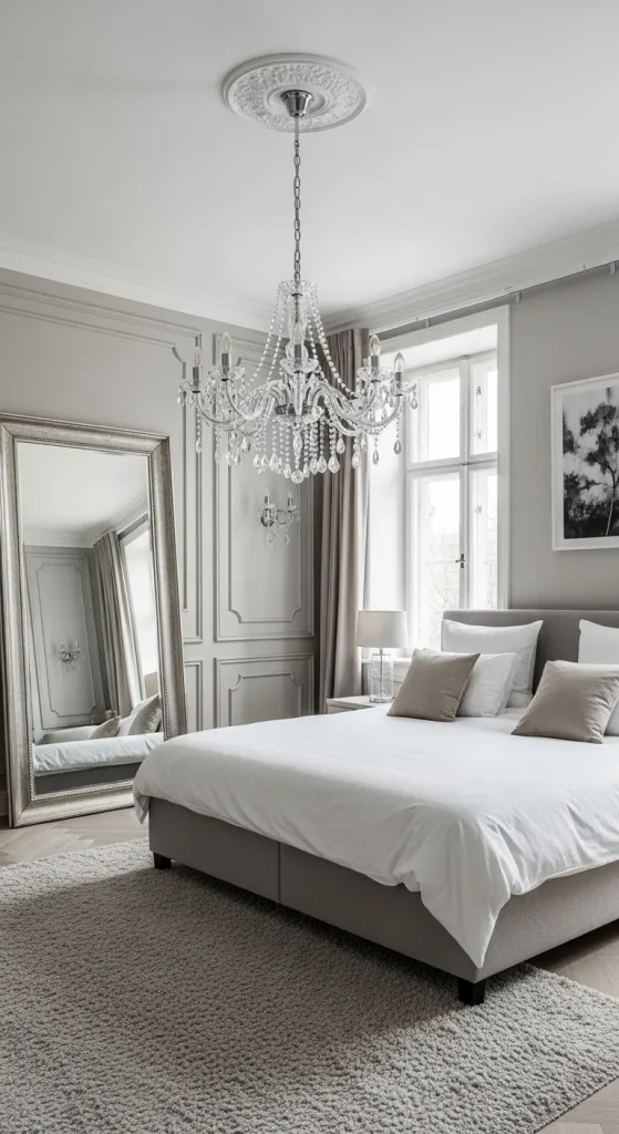 Nothing screams classic elegance more than a beautiful chandelier. Whether crystal, brass, or modern reinterpretations, a chandelier acts as both a light source and a centerpiece. Position it above the bed or in the center of the room to draw the eye upward, giving your bedroom an opulent and grand feel.