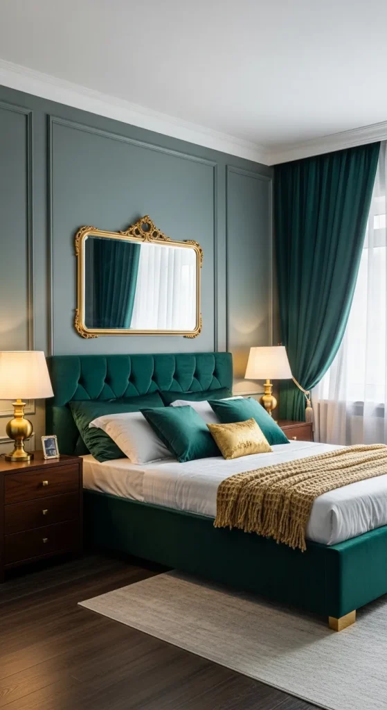 Velvet is synonymous with luxury. Incorporate velvet chairs, throw pillows, or a velvet-upholstered bed to instantly elevate the room. Deep jewel tones like emerald, navy, or burgundy paired with gold or brass accents create a regal atmosphere. Wall panels or upholstered headboards with velvet finish add depth and richness to the New Classic aesthetic.
