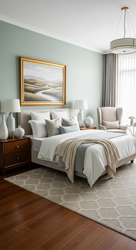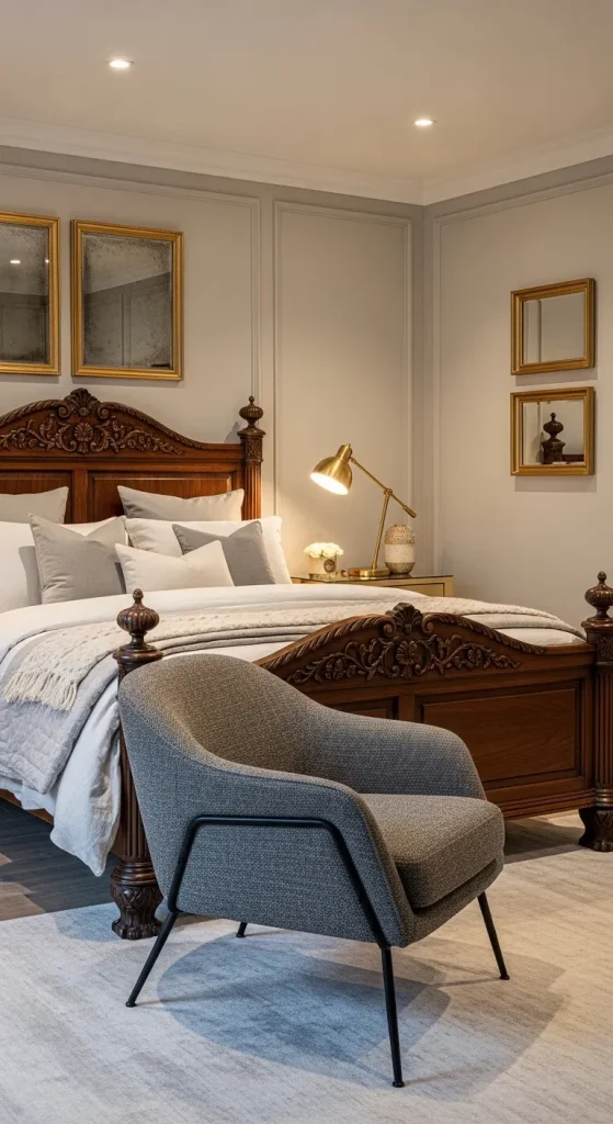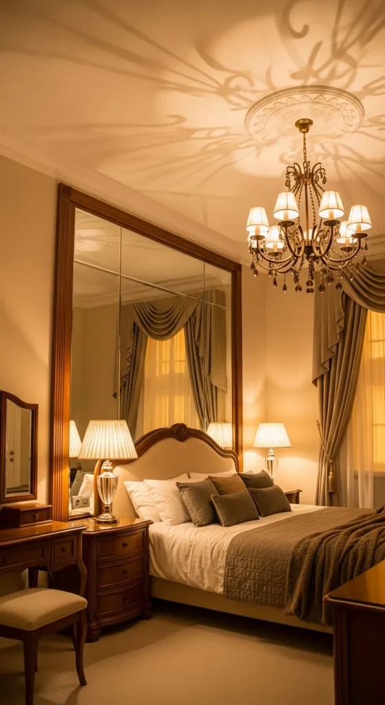 Lighting transforms a bedroom’s mood. Combine ambient lighting with bedside lamps, wall sconces, and a chandelier to create layered illumination. Soft, warm lights enhance the classic ambiance, while strategically placed mirrors reflect light and make the room feel airy and expansive.