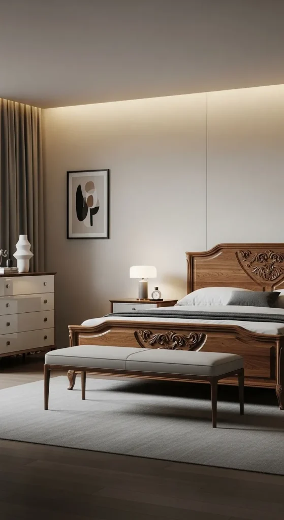 New Classic bedrooms don’t need to be over-the-top. Minimalist luxury focuses on quality over quantity. Choose a few statement pieces: a carved bed frame, a sleek bench at the foot of the bed, and a beautiful dresser. Keep clutter minimal, but ensure each piece exudes elegance and craftsmanship.