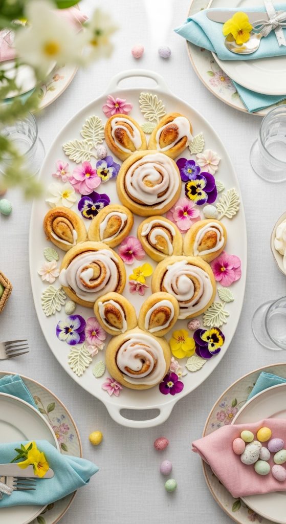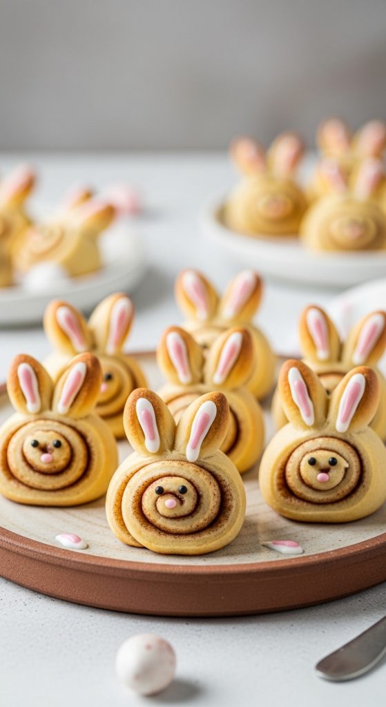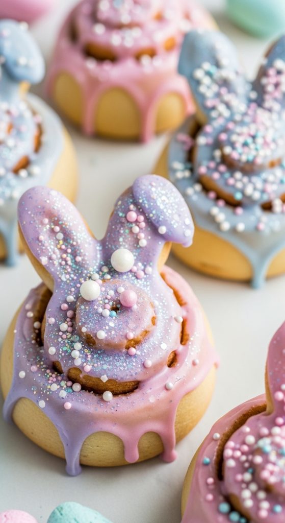 Bring soft pastel colors into your kitchen this Easter. Ice your bunny cinnamon rolls with pale pink, blue, or lavender glaze. Sprinkle edible glitter or tiny sugar pearls for a dreamy, whimsical effect. This version looks straight out of a Pinterest board and adds an elegant touch to your Easter table.