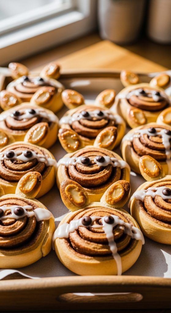 Start simple with the timeless charm of a classic bunny face. Shape your cinnamon rolls into a circular face, add almond slices for ears, and use chocolate chips for eyes and a tiny nose. Drizzle a soft icing glaze for a sweet finishing touch. This design is perfect for beginners and still has maximum cuteness impact.