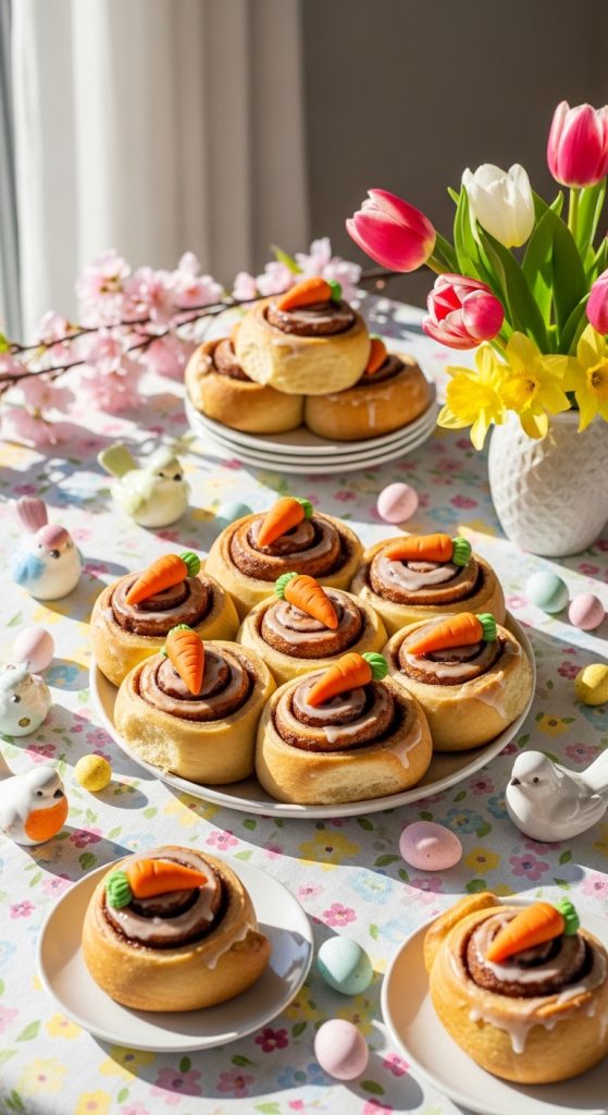 Combine the flavors of Easter with a visual treat. Make your cinnamon rolls as usual, but after baking, top them with a small marzipan or fondant carrot. It adds a playful and colorful element, perfect for kids’ Easter baskets or brunch tables. The bright orange carrot contrasts beautifully with golden-brown rolls.