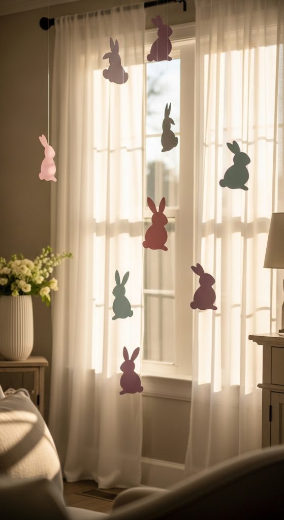 Soft pastel bunny silhouettes create an elegant yet playful Easter statement. Cut large bunny shapes from pastel cardstock in shades of blush pink, baby blue, lavender, and soft yellow. Arrange them at different heights across the window using transparent thread so they appear to float.