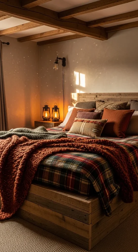 Rustic decor is all about warmth and comfort. Reclaimed wood furniture, exposed beams, and earthy textiles create a cozy environment perfect for couples. Layer chunky knit blankets, plaid throws, and textured rugs to add softness. Earth-toned cushions and bedside lanterns complete the inviting look. This style creates a safe, intimate retreat where couples can enjoy relaxed evenings together.