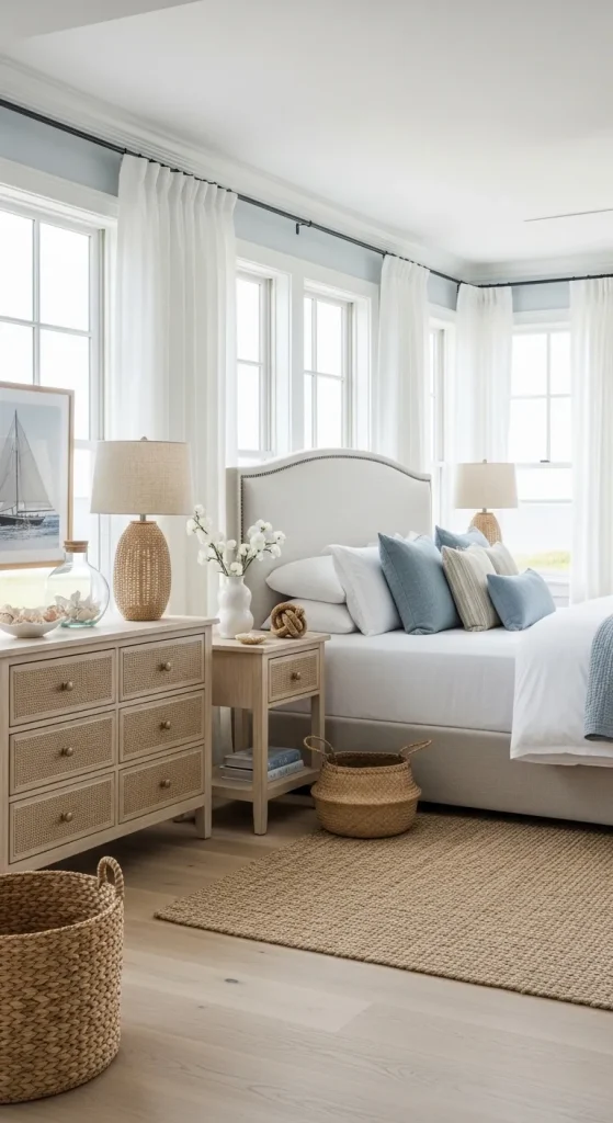 A coastal-themed master bedroom brings serenity and freshness into your space. Use soft blues, sandy beige, and crisp whites to emulate the beach’s calming palette. Incorporate light wooden furniture, woven baskets, and nautical accents like rope mirrors or seashell decor. Layer lightweight curtains and airy bedding for a breezy atmosphere. This decor style is ideal for couples seeking relaxation, evoking a permanent vacation vibe at home.