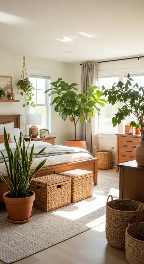 Couples who love tranquility will enjoy a nature-inspired bedroom. Bring the outdoors in with plants, botanical prints, or wooden furniture. Use earthy tones like olive green, tan, and terracotta to create a warm atmosphere. Natural fiber rugs, linen bedding, and wicker baskets enhance the organic feel. Large windows or sheer curtains allow sunlight to pour in, making the room feel airy and serene.