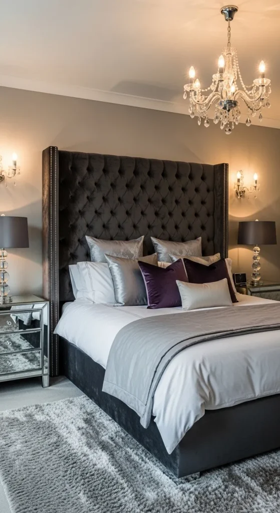 Bring the luxury of a five-star hotel into your home. Opt for a high upholstered bedhead, crisp white bedding, and glossy surfaces like mirrored nightstands. Layer textures with silk or velvet cushions and a thick, cozy rug. Add ambient lighting such as wall sconces and floor lamps to set the perfect mood. A small seating area with a chaise lounge or armchairs can complete the look, making your master bedroom feel indulgent and romantic.