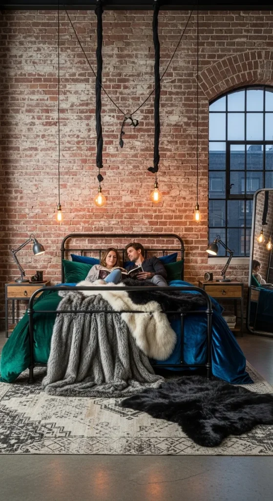 For couples who appreciate edgy, contemporary design, an industrial-style bedroom can be both stylish and cozy. Exposed brick walls, metal bed frames, and vintage-style lighting create character. Pair raw textures with softer elements like velvet bedding or faux fur throws to balance masculinity with warmth. A neutral color palette with hints of dark green, navy, or copper adds sophistication without overwhelming the space.
