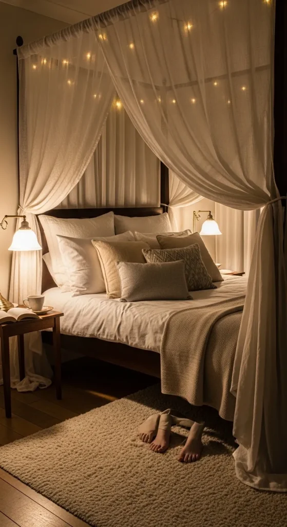 Nothing says romance quite like a canopy bed. Draped soft fabrics like linen or sheer cotton can create an ethereal, dreamy feel. Choose warm lighting like bedside lamps with dimmers or fairy lights to enhance intimacy. Add plush rugs and accent pillows in complementary shades to make the room inviting. This decor style turns your bedroom into a private sanctuary where couples can unwind together after a long day.