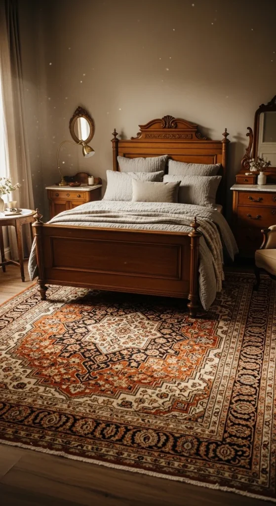 A Persian or Oriental rug adds warmth, texture, and color to your antique bedroom. These handwoven rugs feature intricate patterns that complement antique furniture beautifully. Placing them under the bed or in seating areas creates a luxurious foundation, making the bedroom feel elegant and inviting.