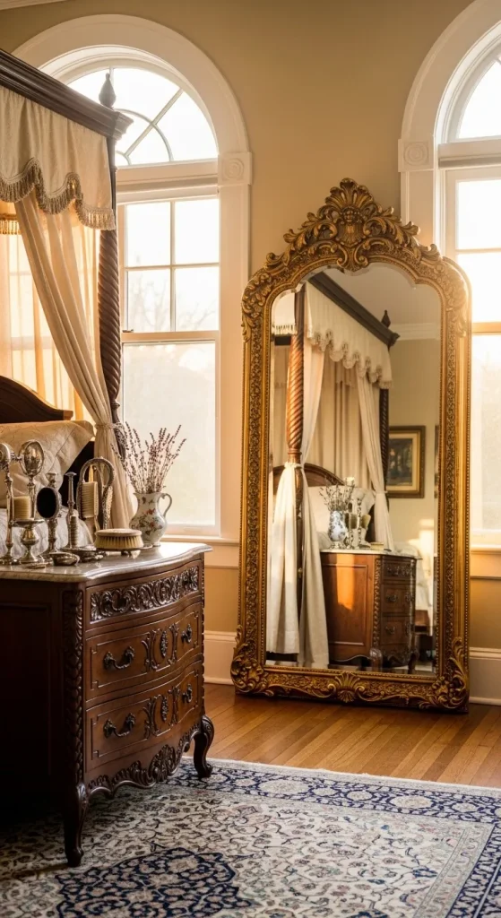 Mirrors with ornate frames are a must-have for an antique master bedroom. Opt for gilded, carved, or distressed wood frames to match your décor. Placing a large mirror opposite a window will also amplify natural light, giving the room an airy yet timeless feel. Small vintage hand mirrors can also add decorative accents on dressers or vanities.