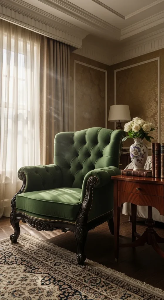 Adding an antique armchair in your master bedroom corner creates a cozy reading nook with a touch of sophistication. Look for tufted velvet, leather, or patterned upholstery with wooden carved frames. These chairs not only offer comfort but also enhance the vintage appeal, making every corner of your bedroom a visual delight.