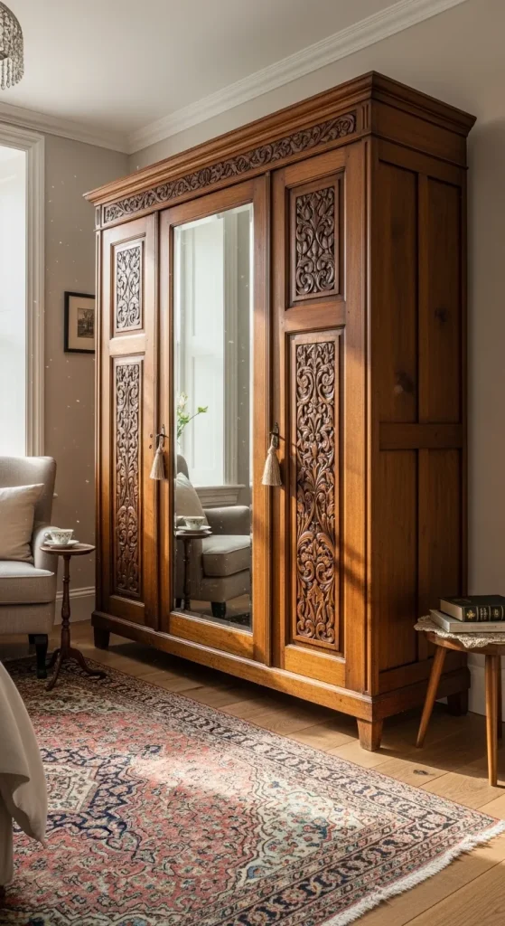 Tall, antique wardrobes with ornate paneling add both function and beauty. Choose wardrobes with mirrored doors or hand-painted motifs to bring historical charm into your space. These pieces make a bold statement while keeping the room organized and stylish. Complement them with vintage rugs and elegant drapery for a complete antique look.