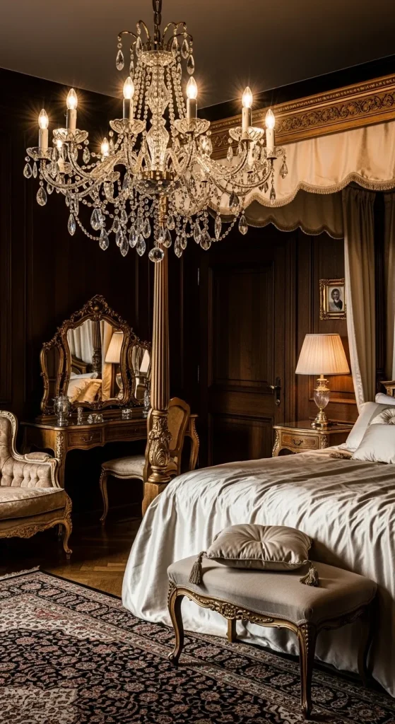 A grand chandelier can elevate an antique master bedroom by adding elegance and sophistication. Crystal chandeliers, wrought iron, or vintage brass fixtures create a warm glow, highlighting the beauty of antique furniture. Positioning the chandelier above the bed or near a sitting area enhances the room’s opulence and charm.