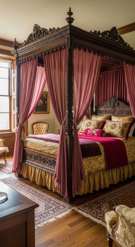 A vintage canopy bed serves as a stunning centerpiece for any antique-themed master bedroom. Choose a solid wood frame with intricate carvings, floral patterns, or regal motifs. Draping the canopy with sheer linen or velvet fabric adds a romantic and cozy vibe. Antique brass or bronze bedposts enhance the old-world charm, creating a bedroom that feels both royal and inviting.