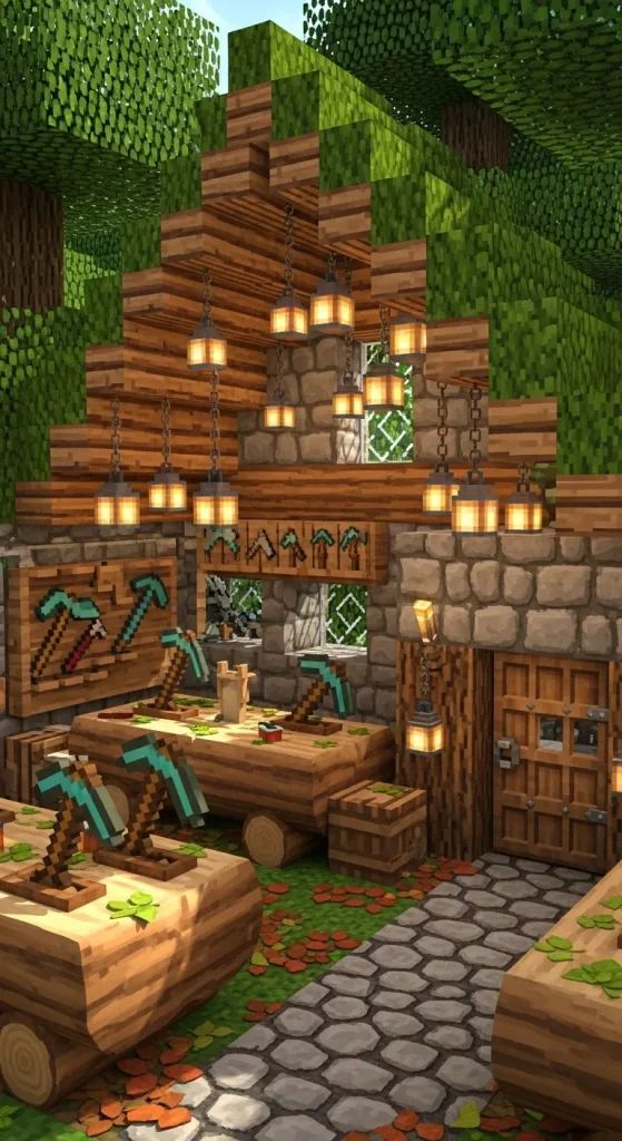 Bring nature into your builds with a Woodland Workshop. Incorporate logs, leaves, and natural stone to create a workshop that blends seamlessly into a forest. Add crafting tables, anvils, and tool racks. Use lanterns hanging from tree branches and a cobblestone pathway to complete the natural, whimsical look.