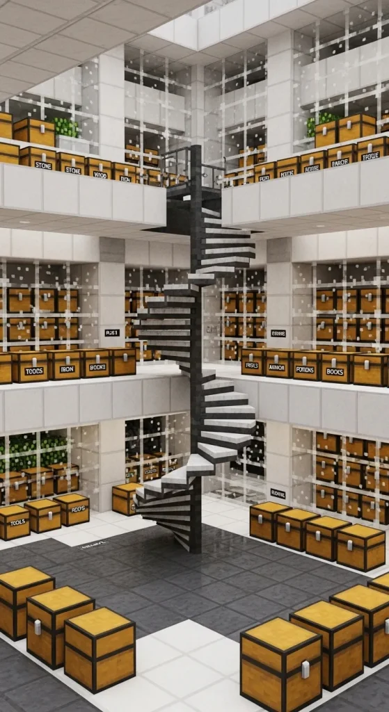 A Modern Storage Loft keeps your items organized while adding elegance to your base. Use concrete, glass, and polished stone for a modern look. Build multiple storage levels, label chests with item frames, and add a spiral staircase or ladder. This DIY area balances functionality and style effortlessly.