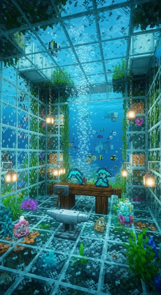 Why stay on land when you can build underwater? An Underwater DIY Area uses glass walls and ceiling to create an aquatic workspace. Use prismarine blocks and sea lanterns for a shimmering effect. Decorate with coral and aquatic plants. This area is perfect for players wanting a unique and serene DIY corner.