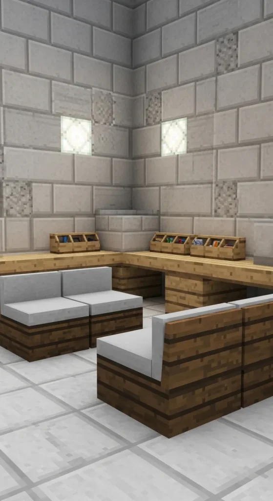 Sometimes simplicity is key. A Minimalist Workbench Corner uses sleek designs with minimal clutter. Use smooth stone slabs, quartz blocks, and clean wooden planks. Place crafting tables, furnaces, and anvils in an organized layout, and add a small seating area with simple chairs and a table. Perfect for players who enjoy clean, modern aesthetics.