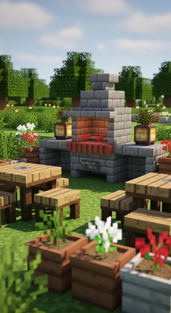 Bring life to your garden with a Minecraft Outdoor BBQ Station. Build a stone or brick grill, add wooden tables and benches, and decorate with potted plants and lanterns. Surround the area with a small fence or hedges for a cozy outdoor feel. This design works perfectly for social areas in multiplayer worlds.