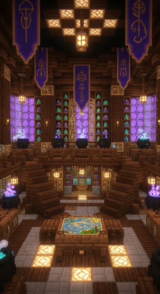 Turn your potion-making into an art with an Elegant Potion Room. Use dark oak wood and purple stained glass to create a mystical atmosphere. Place brewing stands on elevated platforms and add bookshelves to simulate a wizard’s laboratory. Use glowstone or shroomlight for ambient lighting. This area is not just functional but also visually enchanting.