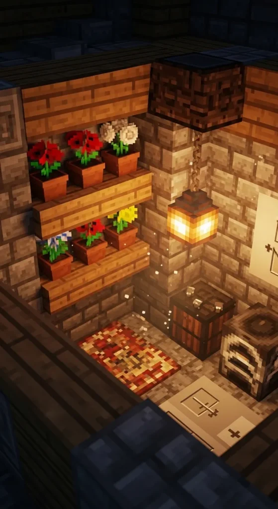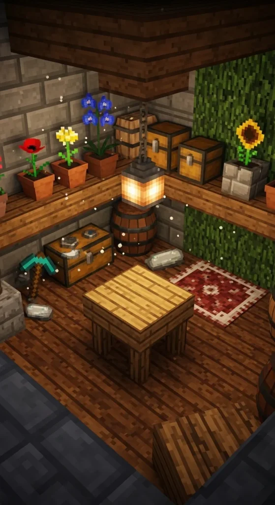 A Cozy Crafting Nook combines functionality with warmth. Tucked in a corner of your base, this area is perfect for organizing all your crafting stations. Use wooden planks and stone bricks for a rustic look, add shelves with flower pots, and hang lanterns for soft lighting. Adding a small carpeted area makes it inviting and homey.