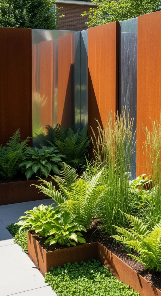 For industrial or modern minimalistic gardens, corrugated metal panels provide durability, privacy, and an edgy aesthetic. Choose galvanized, rusted, or painted finishes depending on your design theme. Their rigid, reflective surface contrasts beautifully with soft greenery, making them perfect as accent walls or privacy dividers for large backyards.