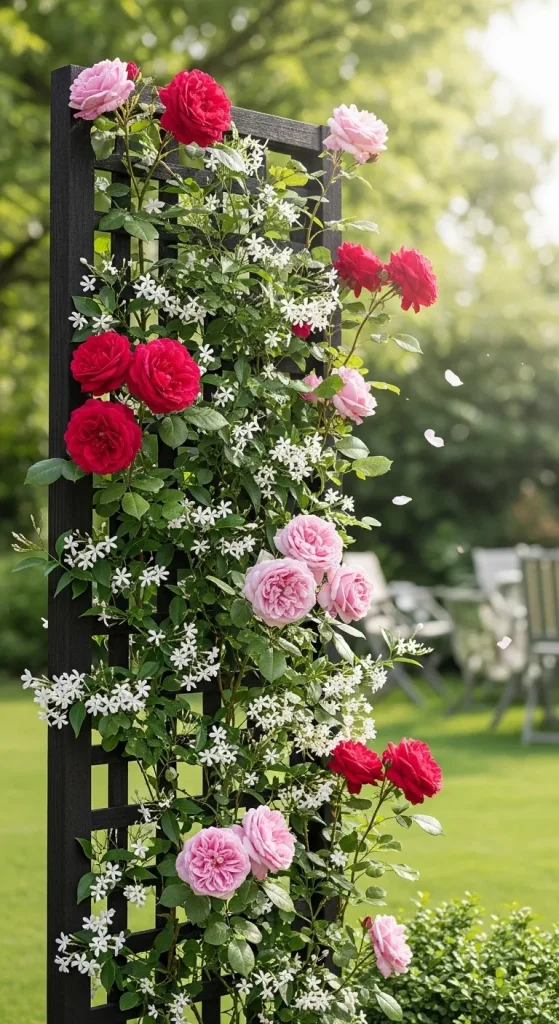 Trellis panels double as support structures for climbing plants while creating privacy. They can be made from wood, metal, or composite materials. As plants like roses, jasmine, or clematis grow, the trellis transforms into a living wall of blooms. This is perfect for adding natural fragrance, vibrant color, and vertical interest to any outdoor space.
