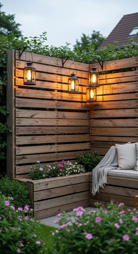 For a rustic or farmhouse vibe, reclaimed wood pallet panels are perfect. Each panel is unique, with textures and colors that tell a story. Arrange them vertically or horizontally, leave gaps for airflow, and treat the wood for outdoor durability. Adding hanging planters or fairy lights can create a cozy, inviting space that blends with nature.