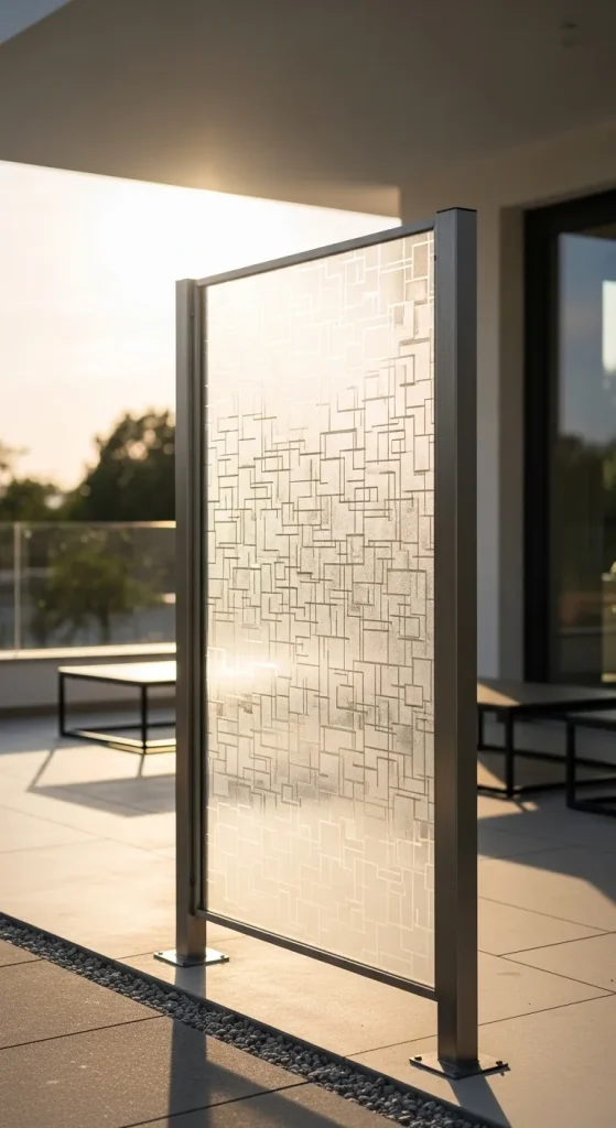 Frosted, textured, or colored glass panels are ideal for modern outdoor spaces where privacy and light are equally important. Glass panels can be framed with metal or wood, offering a sleek, polished look. They reflect sunlight beautifully, creating a luminous ambiance, and are especially elegant around patios, hot tubs, or pool areas.