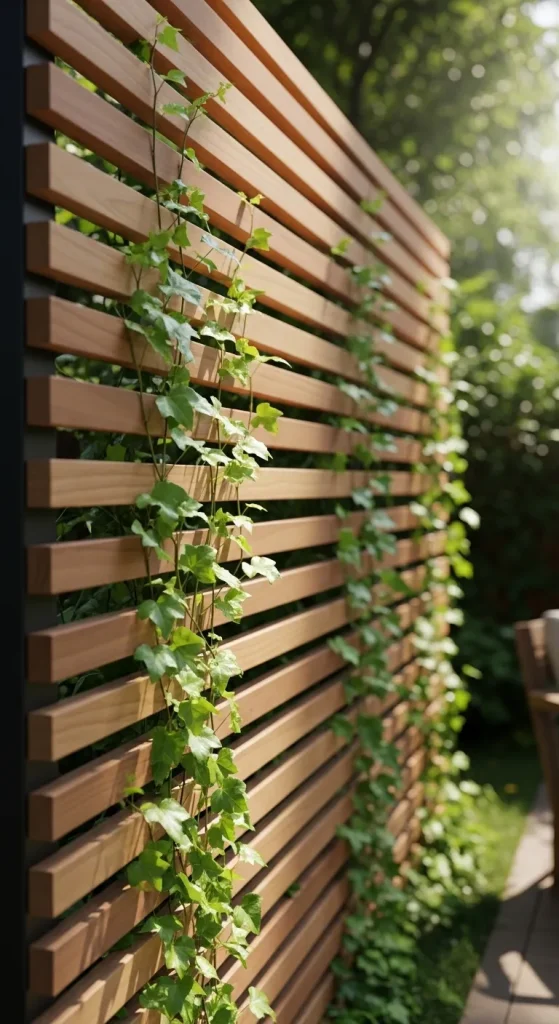 Wooden slat panels are timeless and versatile. Using horizontal or vertical wooden slats with gaps in between, these panels create a balance of privacy and openness, allowing light and air to flow naturally. For a contemporary look, choose sleek, untreated hardwood or stained cedar. Add climbing plants like ivy or wisteria for a touch of greenery that softens the structured lines.
