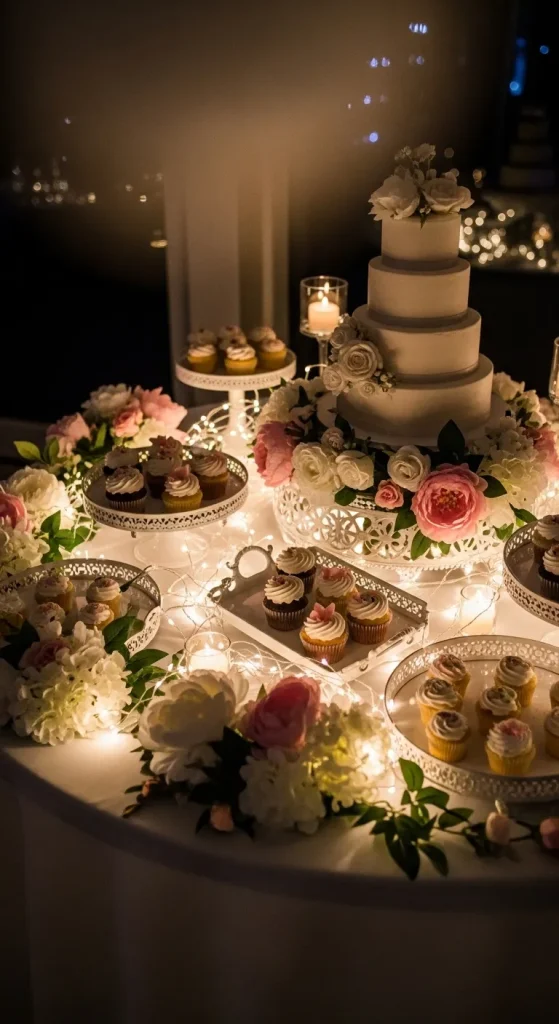 Turn a plain cake table into a centerpiece of its own. Dollar Tree’s decorative trays, cake stands, and faux flowers can be arranged around your wedding cake to make it pop. Add fairy lights or ribbons to enhance the look, giving the cake display a professional touch without the cost.