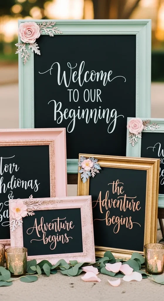 Guide your guests with chic DIY signs. Dollar Tree picture frames, chalkboards, and letter boards can be transformed into welcome signs, seating charts, or table numbers. Add calligraphy, paint, or decorative elements to make the signage reflect your wedding theme while staying budget-friendly.