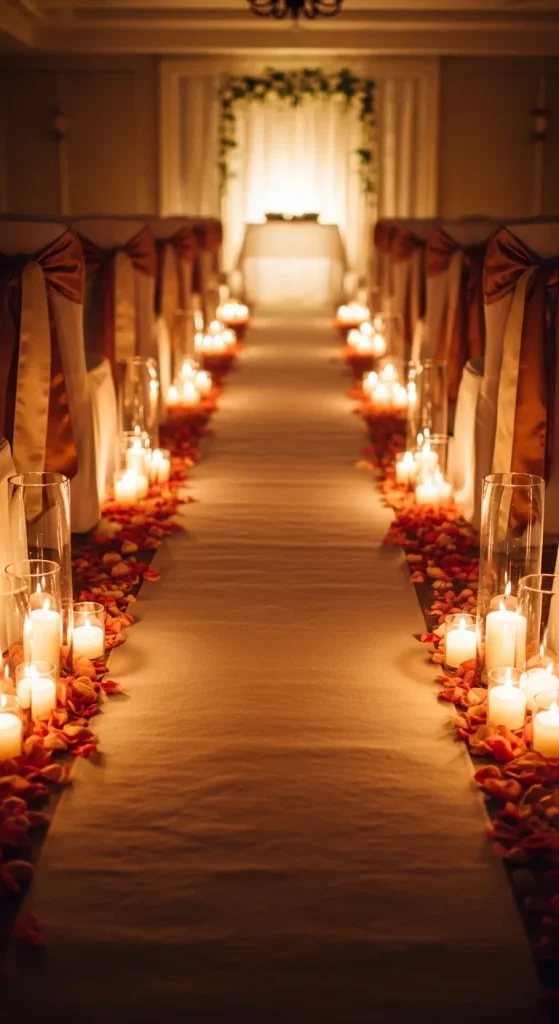 Light the way to the altar with enchanting Dollar Tree candle arrangements. Use hurricane vases, votive candles, and faux petals to line the aisle. This simple setup can be enhanced with ribbon bows or greenery, creating a romantic atmosphere as you walk down the aisle.